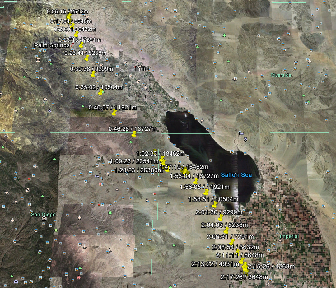 According to the plot on Google Maps, the payload was just north of the Salton Sea at 20k feet traveling south…south toward the Salton Sea. No one wanted to say it, but at this rate there was a chance the payload would end up in the water. This was an eventuality we had not planned for. The Styrofoam would float but would the cameras be destroyed? More importantly, would the SD cards holding the images and video be destroyed if they were exposed to the salty water?